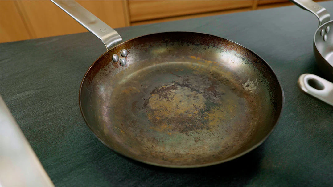 Den första fasen vi ser är en kolstålstekpanna med en klibbig yta.