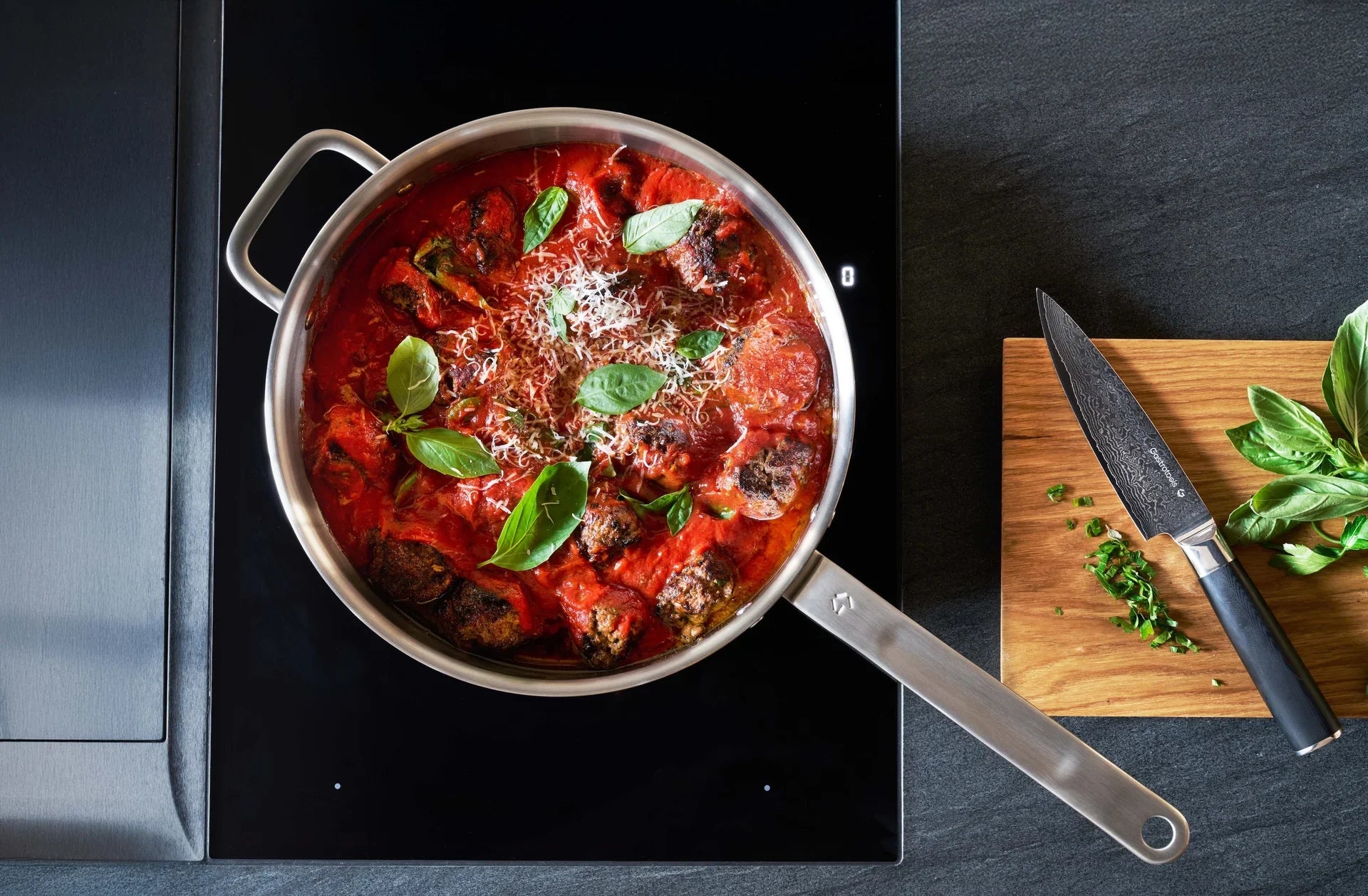 Den 5-ply sauterpannan är kompatibel med alla värmekällor, inklusive induktion, gas och keramikhällar. Pannan kan också enkelt användas i ugnen, upp till 430 grader, vilket gör den perfekt för rätter som behöver tillagas i ugnen.
