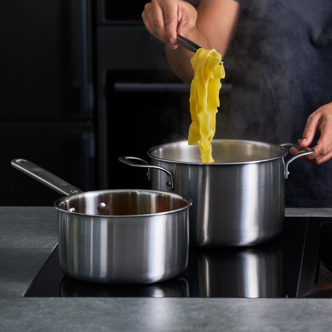 Med sin 5-lagerskonstruktion får du en oförstörbar uppsättning som håller en livstid, tillsammans med alla fördelar med rostfritt stål: lågt underhåll, lämpligt för alla typer av matlagning och helt fritt från PFAS och andra skadliga beläggningar som slits bort med tiden och hamnar i maten.