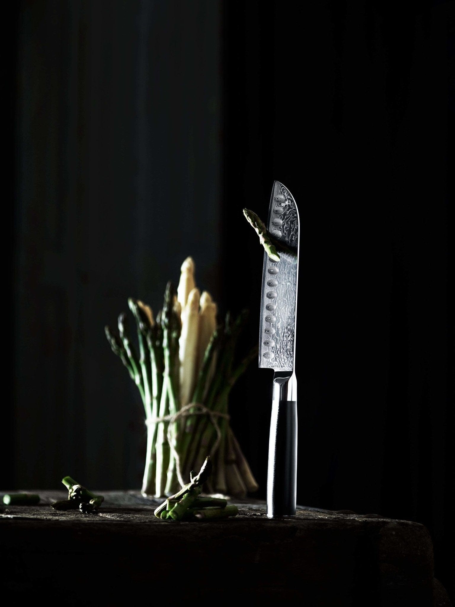 Santoku-kockkniv för alla skärarbeten – med luftkant och ultraskarpa 67 lager stål för minimal friktion.