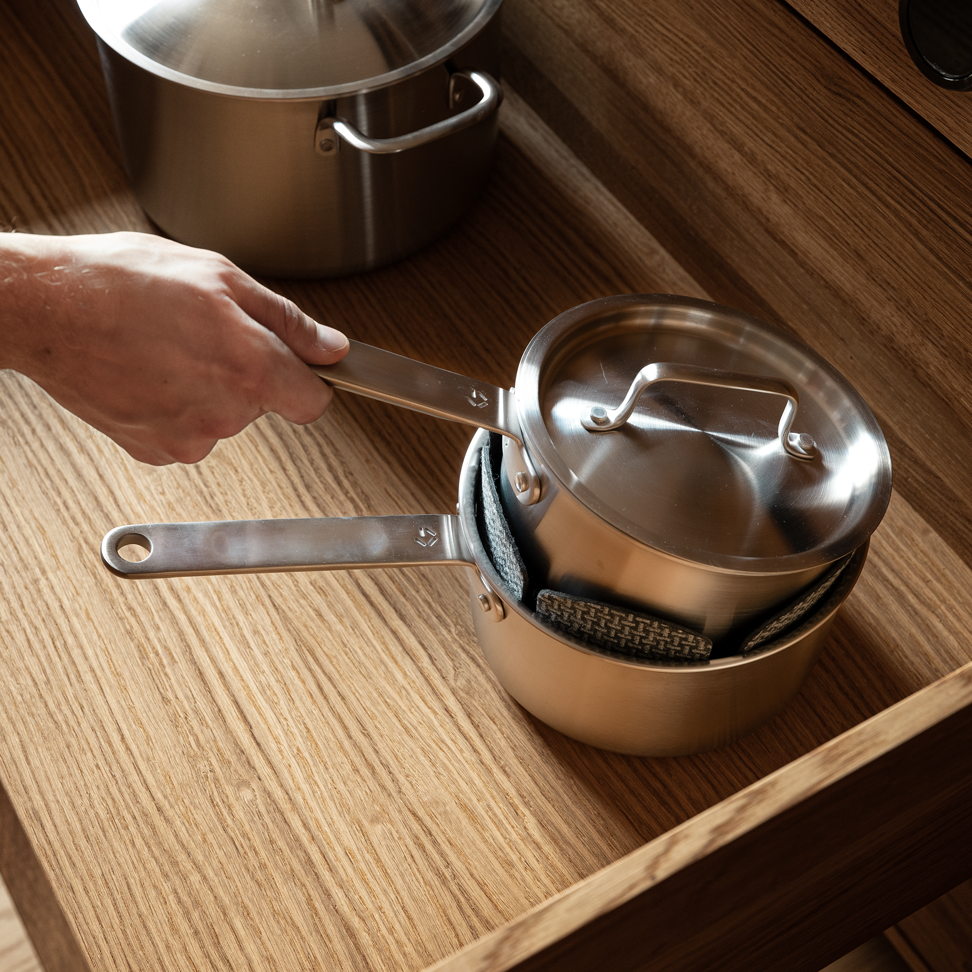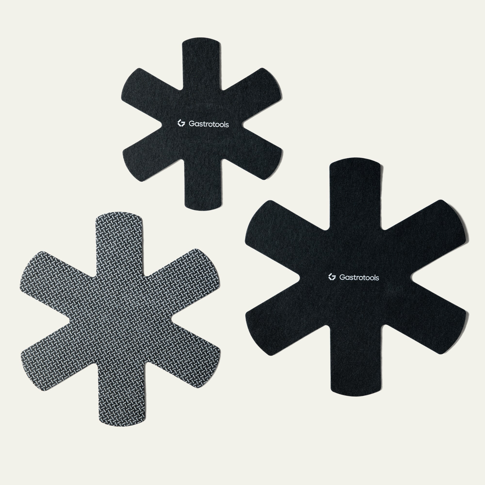 Kastrullskydd är det perfekta tillbehöret för dina kastruller om du förvarar dem staplade på varandra. Designen är elegant och funktionell: tack vare formen på skydden sitter de vid basen av dina stekpannor, så att du enkelt kan stapla dem ovanpå - och du kan till och med använda dem i grytor också.