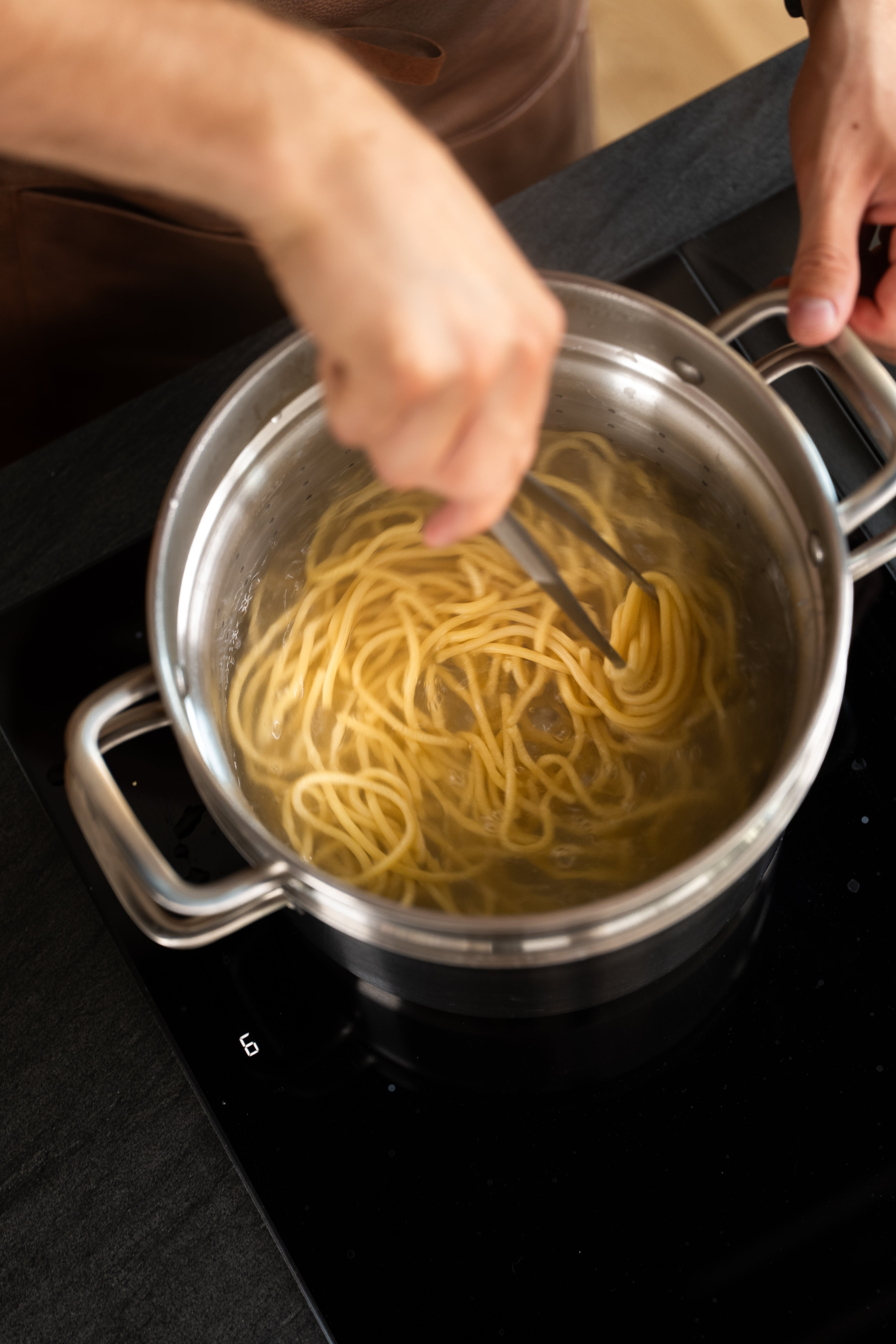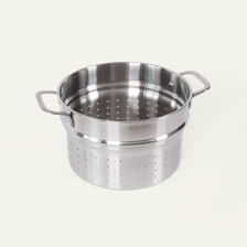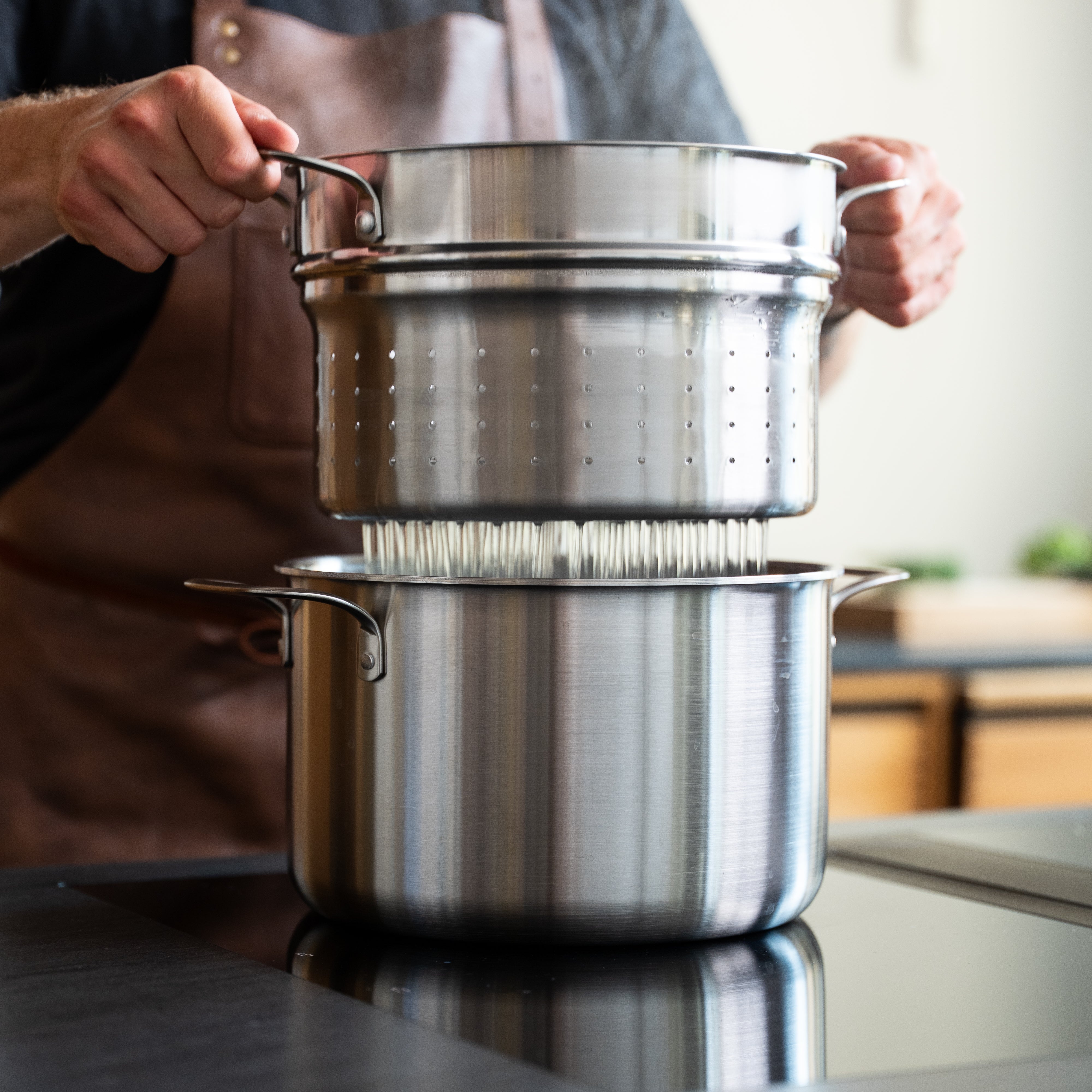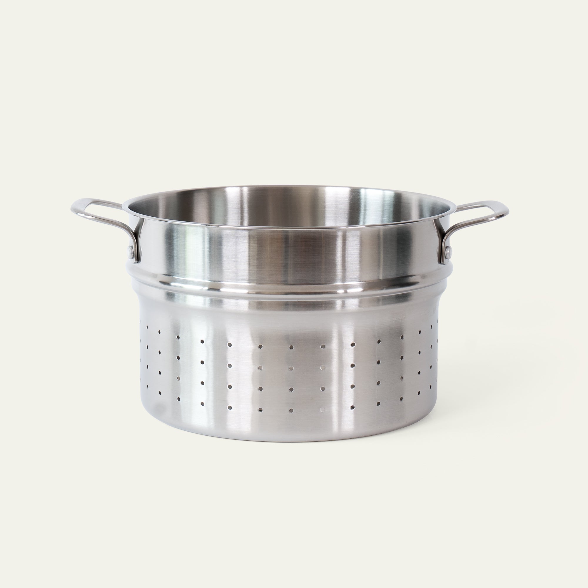 Insatsen är tillverkad i Italien av samma familjeägda företag som tillverkar våra 5-lagerskokkärl. Den är designad för att passa perfekt i vår stora 5-lagersgryta, och de många små hålen säkerställer att pastan stannar där den ska. Men insatsen är inte bara för pasta: använd den för att blanchera sparris, koka potatis eller koka stora mängder ägg. Med sin konstruktion i rostfritt stål är pastainsatsen både hållbar och lätt att underhålla.