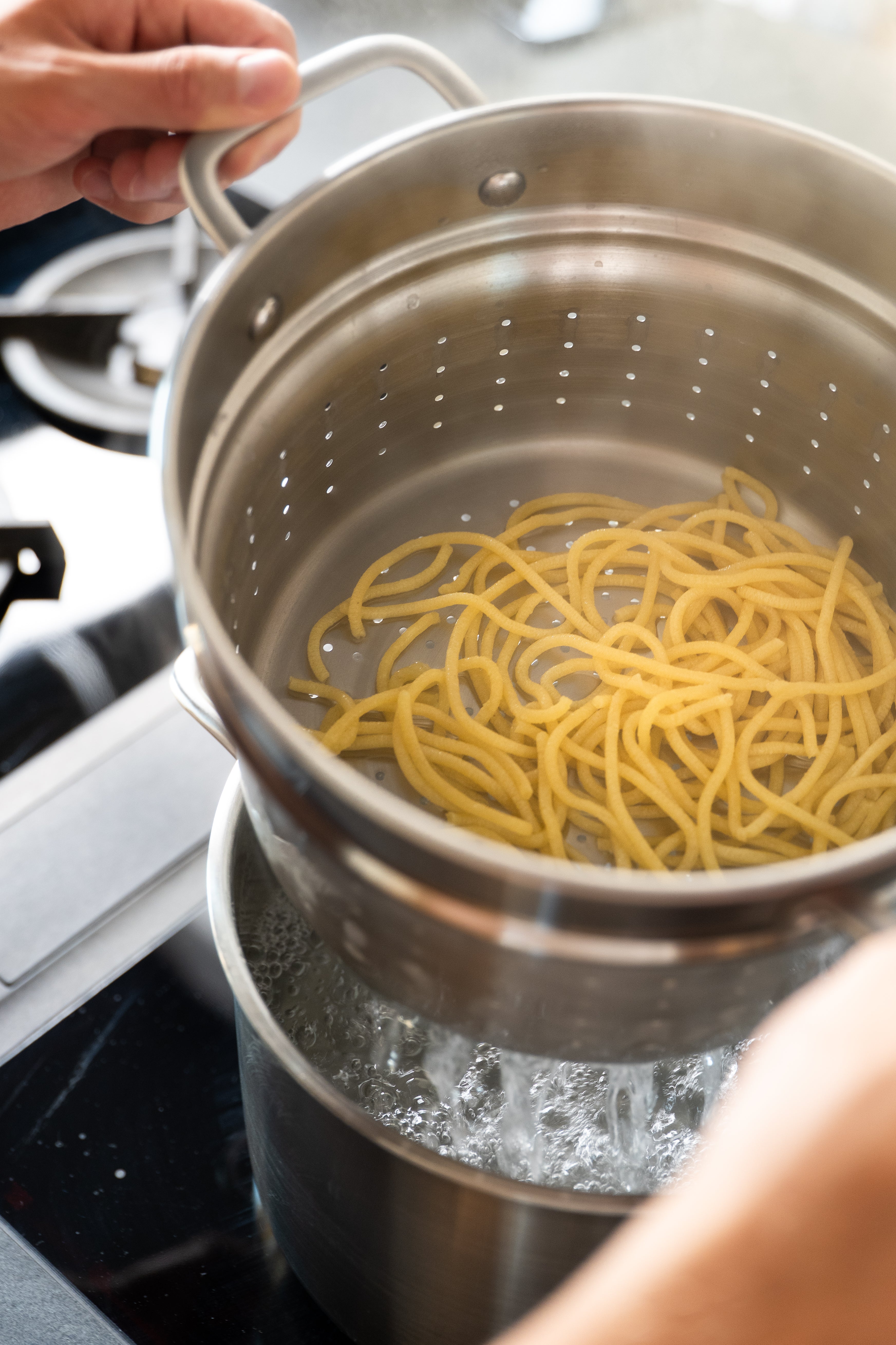 Pastainsatsen är designad för att koka perfekt pasta utan besväret med att hälla kokande pastavatten från grytan, vilket ofta resulterar i pasta i diskhon eller kokande vatten på golvet. De stadiga handtagen på insatsen gör det enkelt att sänka ner den i kokande vatten utan att bränna sig, och lika enkelt att lyfta upp insatsen när maten är klar. Och om du behöver skölja innehållet i kallt vatten för att stoppa tillagningen kan du enkelt lyfta insatsen över den kalla kranen.