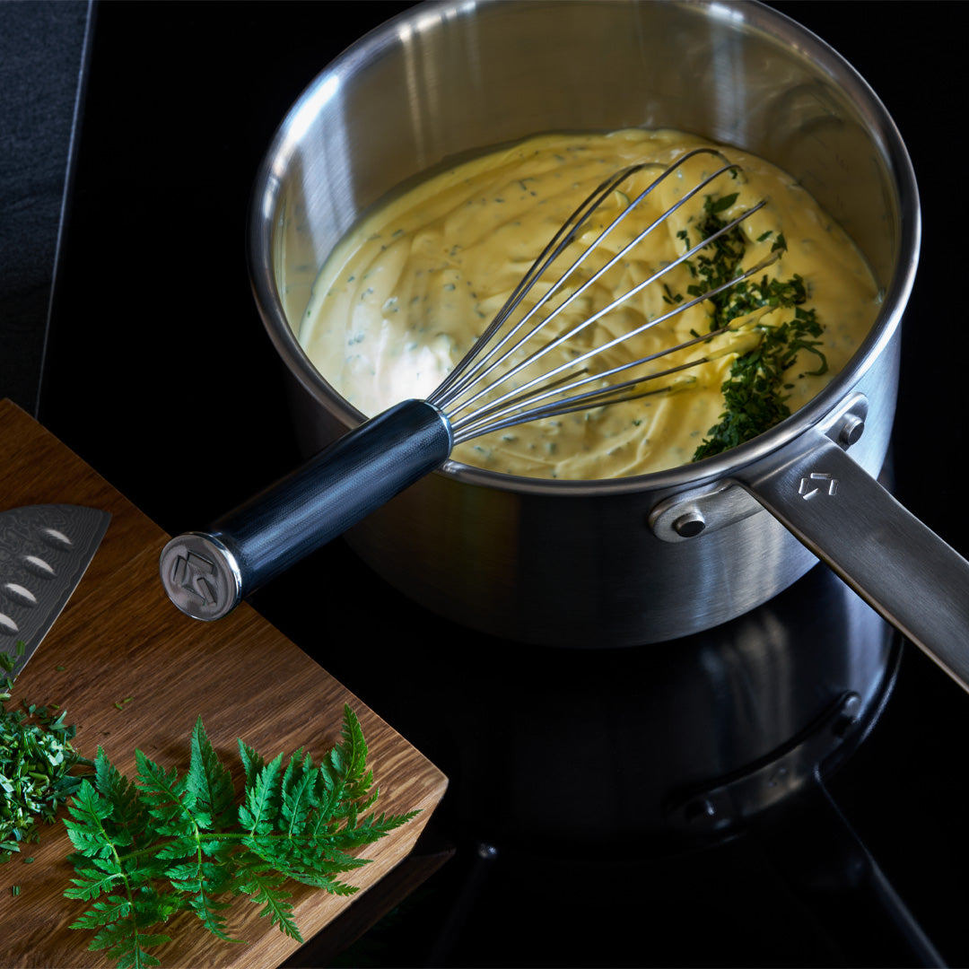 Till skillnad från billigare plast- eller silikonvispar är vår visp tillverkad av rostfritt stål med ett G10-komposithandtag. Det betyder att du inte behöver oroa dig för att din visp ska smälta om du råkar lämna den i grytan - och du kan se fram emot den bästa vispkomforten tack vare komposithandtaget.
