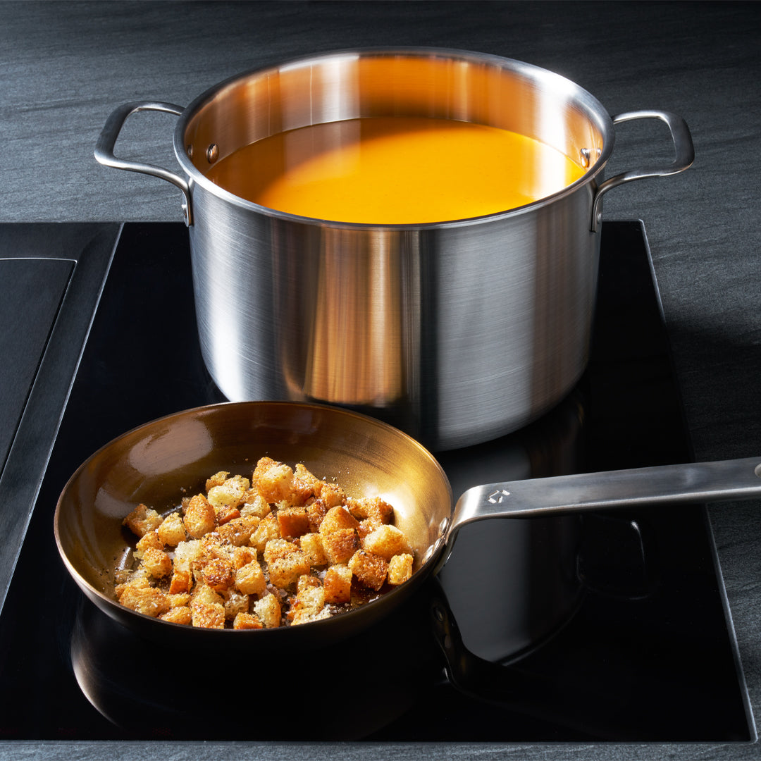 Grytan ger exceptionellt jämn värmefördelning tack vare sin femskiktade konstruktion, jämfört med de tre skikt som vanligtvis finns i rostfritt stål. Detta eliminerar värmepunkter i botten av grytan, vilket säkerställer att maten inte bränns vid, blir ojämnt tillagad eller att såser separeras.