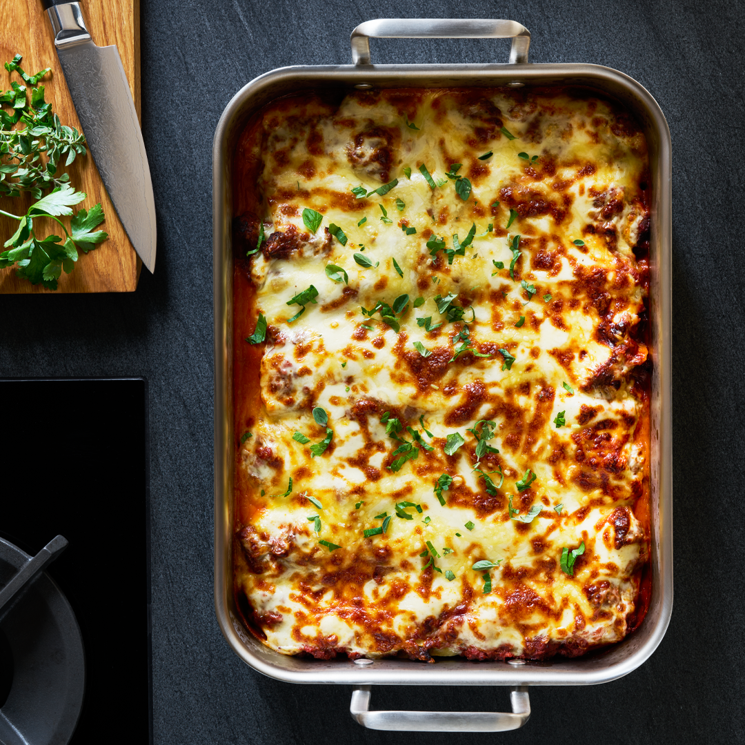 Stekpannan garanterar jämn och snabb värmefördelning tack vare sin femskiktade konstruktion, jämfört med de vanliga trelagerskonstruktionerna hos de flesta rostfria köksredskap. Jämn och effektiv värmeledning är viktigt, oavsett om du lagar lasagne, bakar focaccia eller rostar rotfrukter i ugnen.