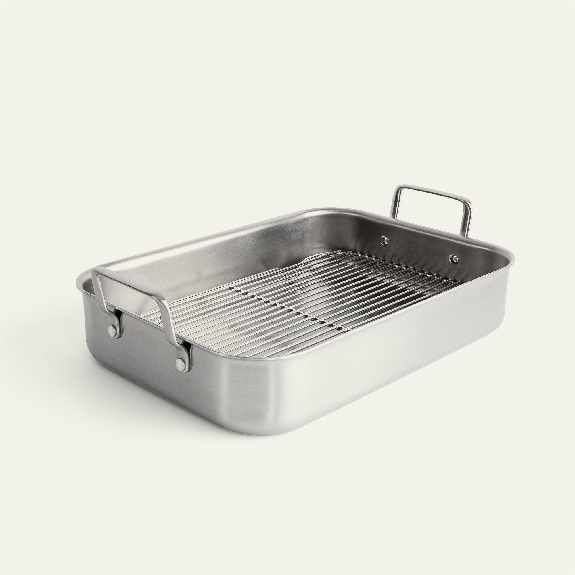 Ugnsformen säkerställer jämn och snabb värmefördelning tack vare sin femlagerskonstruktion, jämfört med de typiska trelagersdesignerna hos de flesta rostfria köksredskap. Enhetlig och effektiv värmeledning är avgörande oavsett om du gör lasagne, bakar focaccia eller rostar rotfrukter. Handtagen är utformade för att ge ett ergonomiskt grepp och enklare hantering, även när du håller i en rykande het ugnsform.