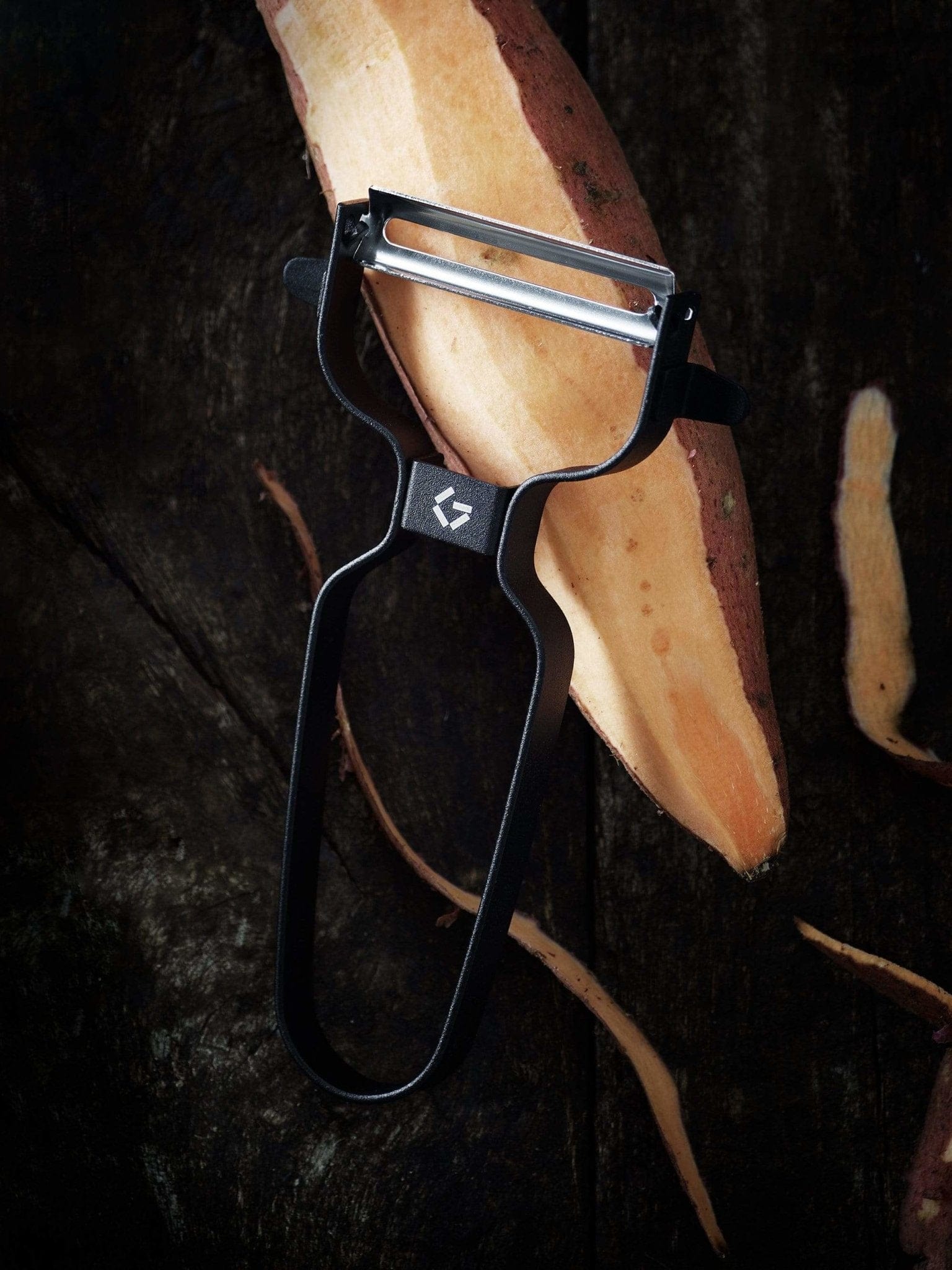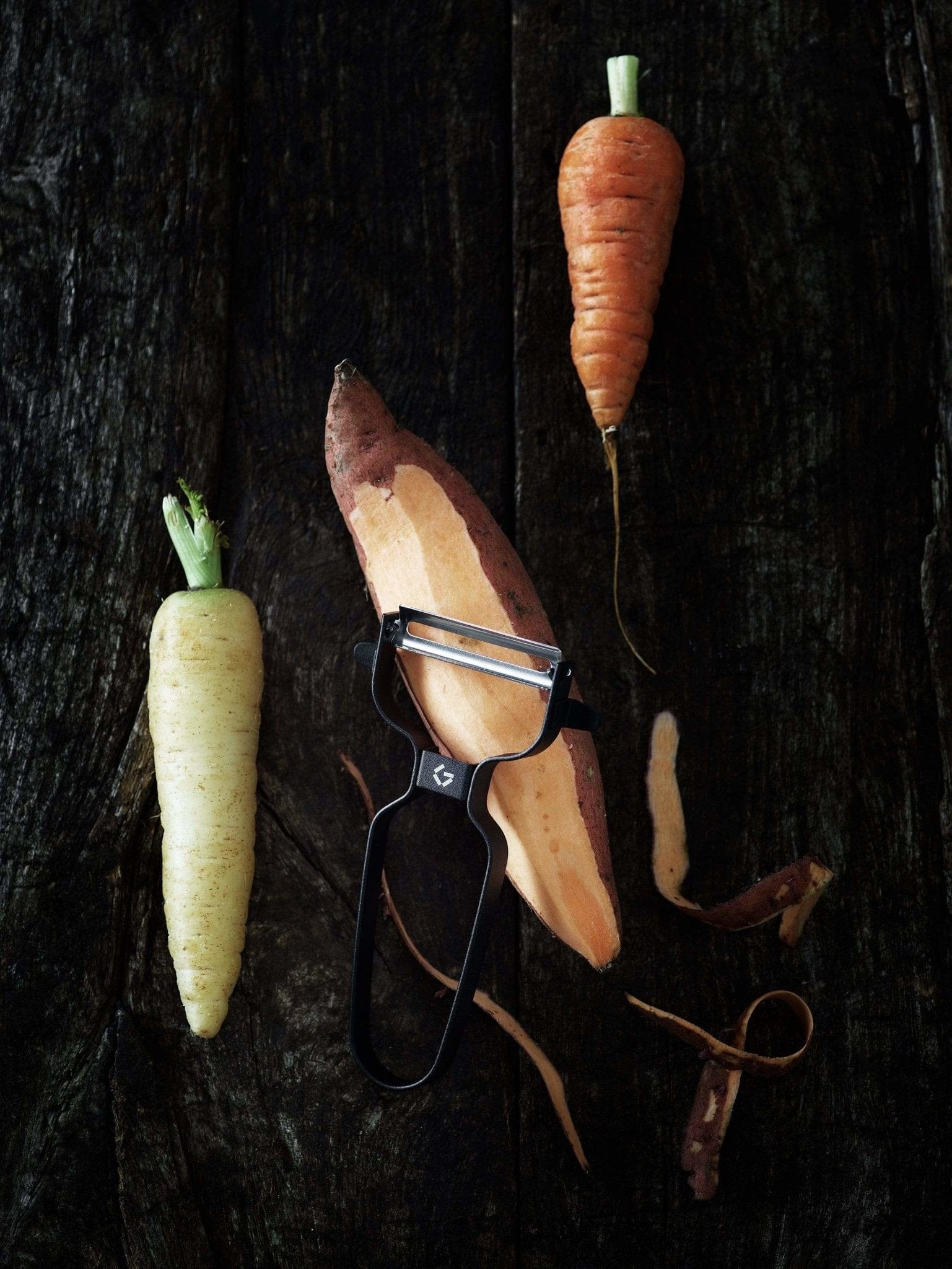 Den eleganta mattsvarta pulverlackeringen ger ett minimalistiskt nordiskt utseende och säkerställer ett bra grepp - även med våta händer. Bladet är tillverkat av härdat rostfritt stål, som är slipat och polerat för maximal skärpa. Det svängbara bladet gör skalaren fördelaktig för att göra tunna, platta remsor - och är perfekt för att skala långsträckta grönsaker som sparris, morötter eller salsifierötter.