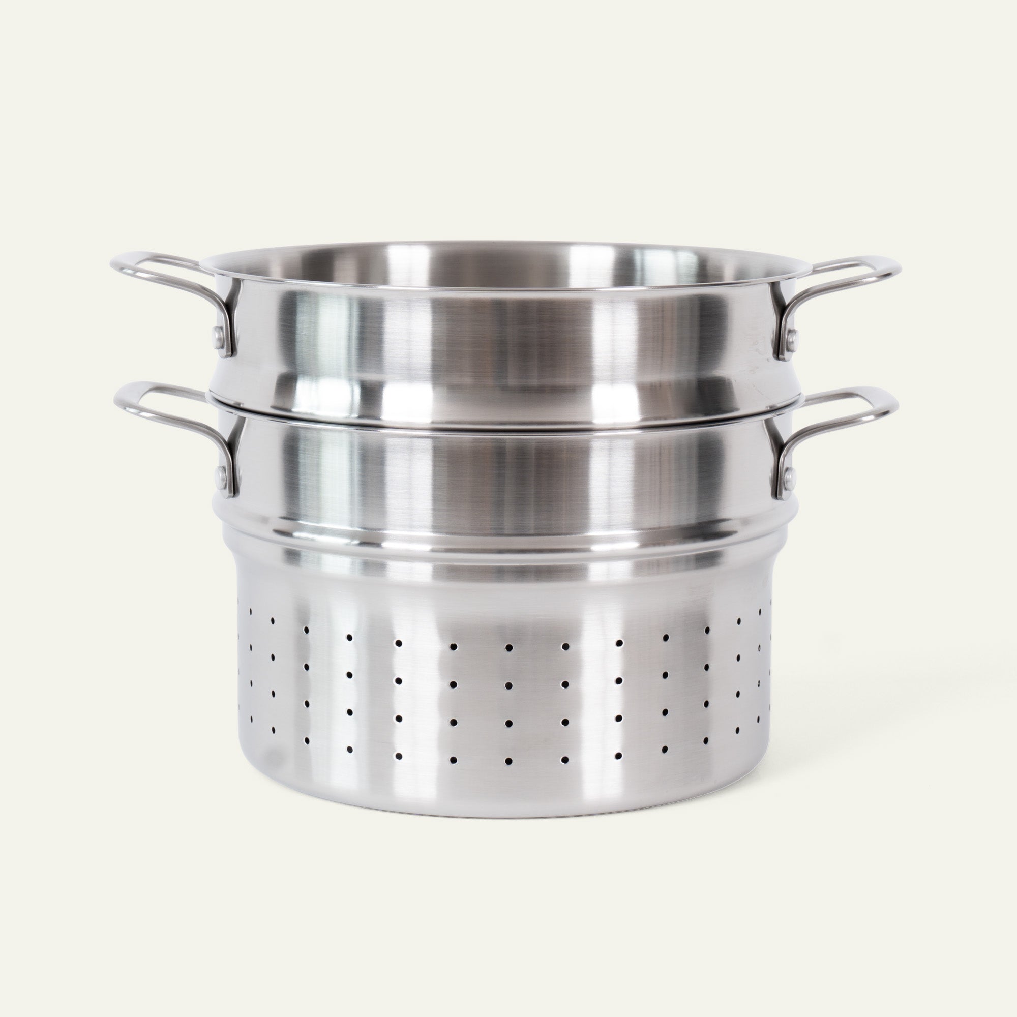 En pasta- och ånginsats är den ideala uppgraderingen för din 5-lagers gryta. De stadiga handtagen på insatserna gör det enkelt att sänka ner dem i kokande vatten eller en ångande gryta utan att bränna dig, och lika enkelt att lyfta upp dem när maten är klar. Och om du behöver skölja innehållet i kallt vatten för att stoppa tillagningen kan du enkelt lyfta insatsen över kallvattnet. Båda insatserna är tillverkade i Italien av samma familjeägda företag som tillverkar vår 5-lagers köksutrustning.