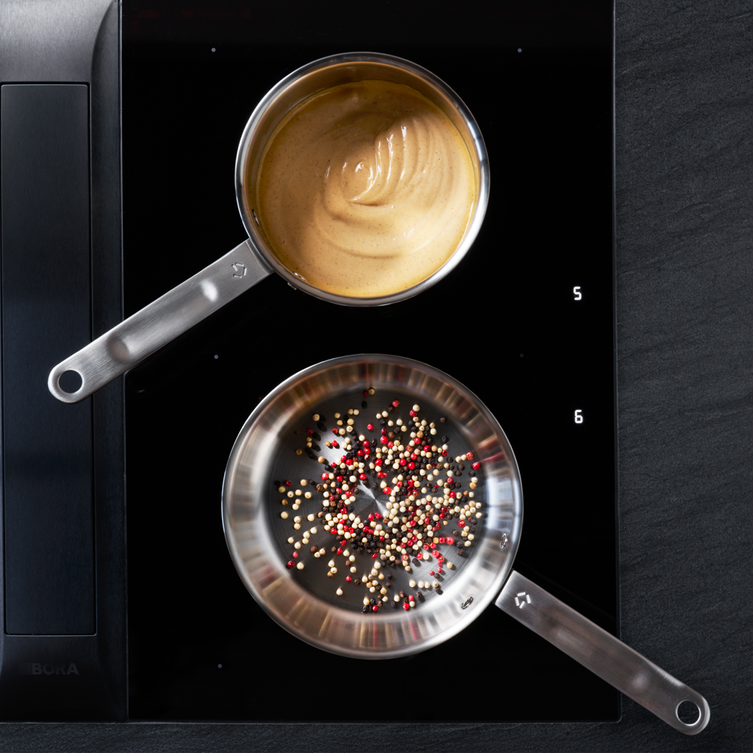 Upplev exceptionellt jämn värmefördelning tack vare den femlagerskonstruktionen, jämfört med de vanliga trelagers kokkärlen i rostfritt stål. Detta eliminerar värmepunkter i botten av dina kastruller eller stekpannor, vilket förhindrar att maten bränns vid, blir ojämnt tillagad eller att såser separeras.
