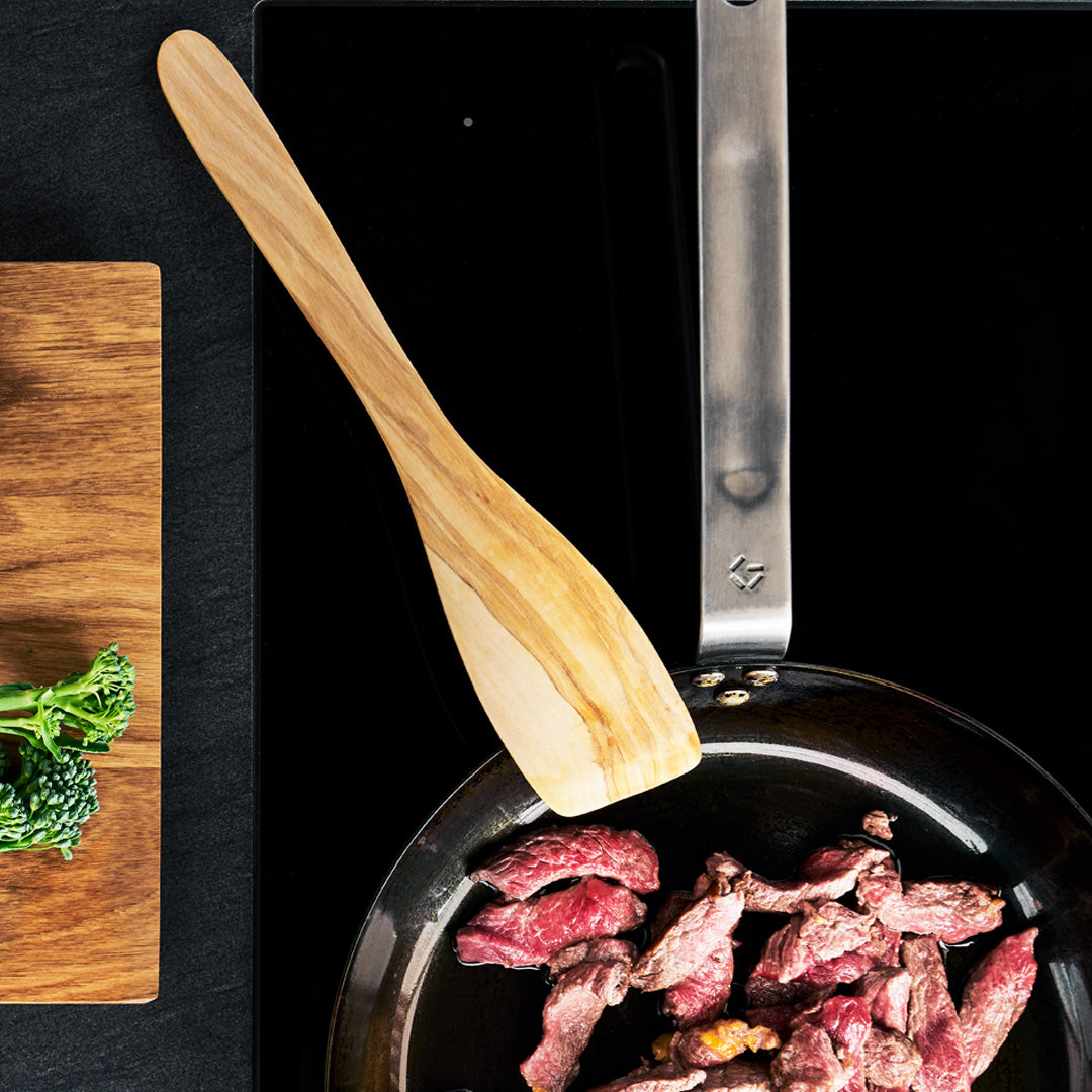 Upplev äkta franskt hantverk med denna 30 cm långa träspatel i olivträ. Perfekt böjd för ergonomisk matlagning och servering. Träspateln är idealisk för stekta grönsaker, såser, fisk och kött, samtidigt som den skyddar dina grytor och pannor. Olivträets täta fibrer och naturliga antibakteriella egenskaper gör det inte bara hygieniskt utan också hållbart och motståndskraftigt. Spateln är behandlad med bivax och bibehåller sin kvalitet över tid och användning - ett måste i alla kök från en fransk tillverkare som specialiserat sig på hantverksprodukter i trä sedan 1892. Med sitt naturliga utseende och sin tidlösa design är den ett autentiskt tillskott till alla kök.