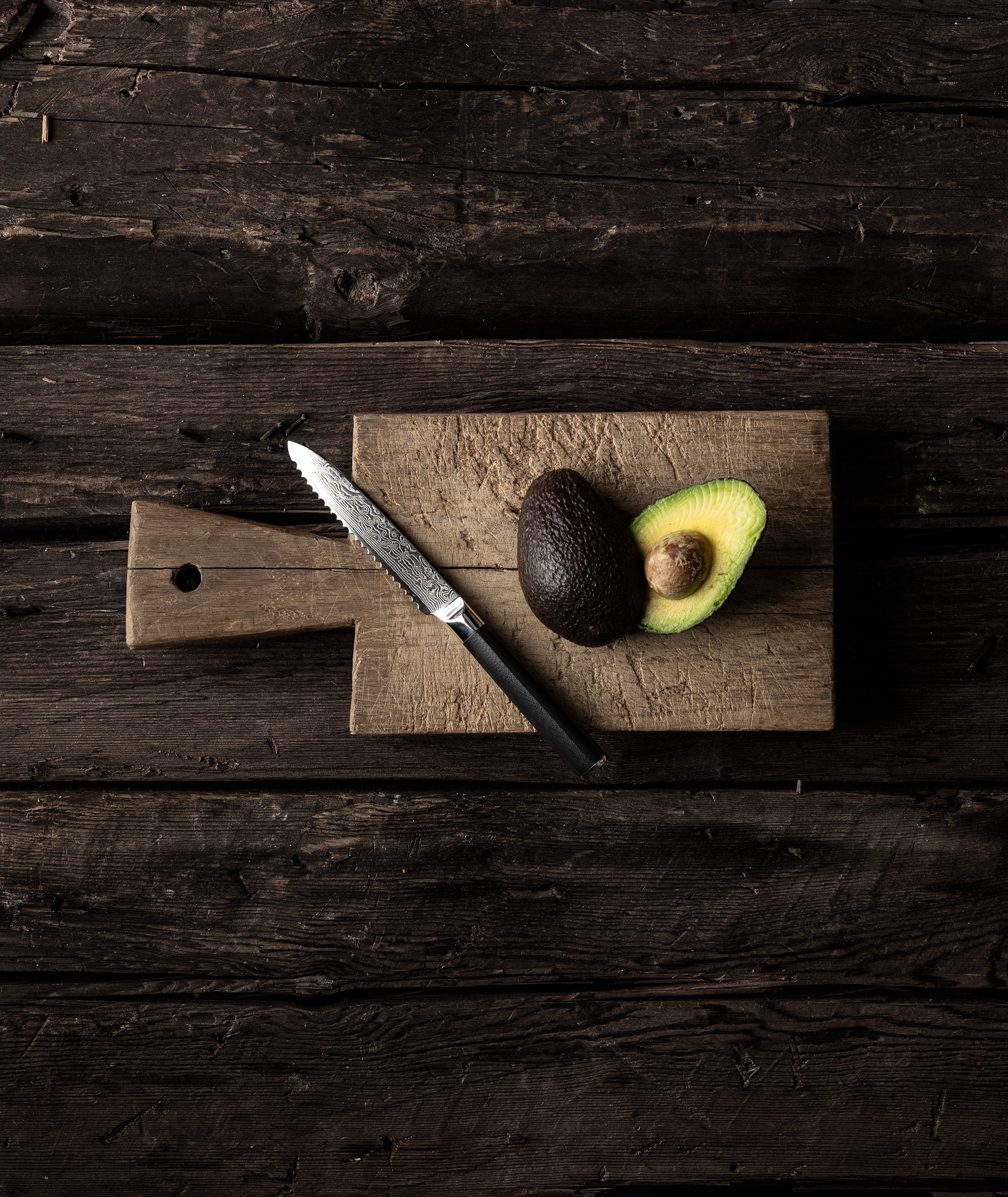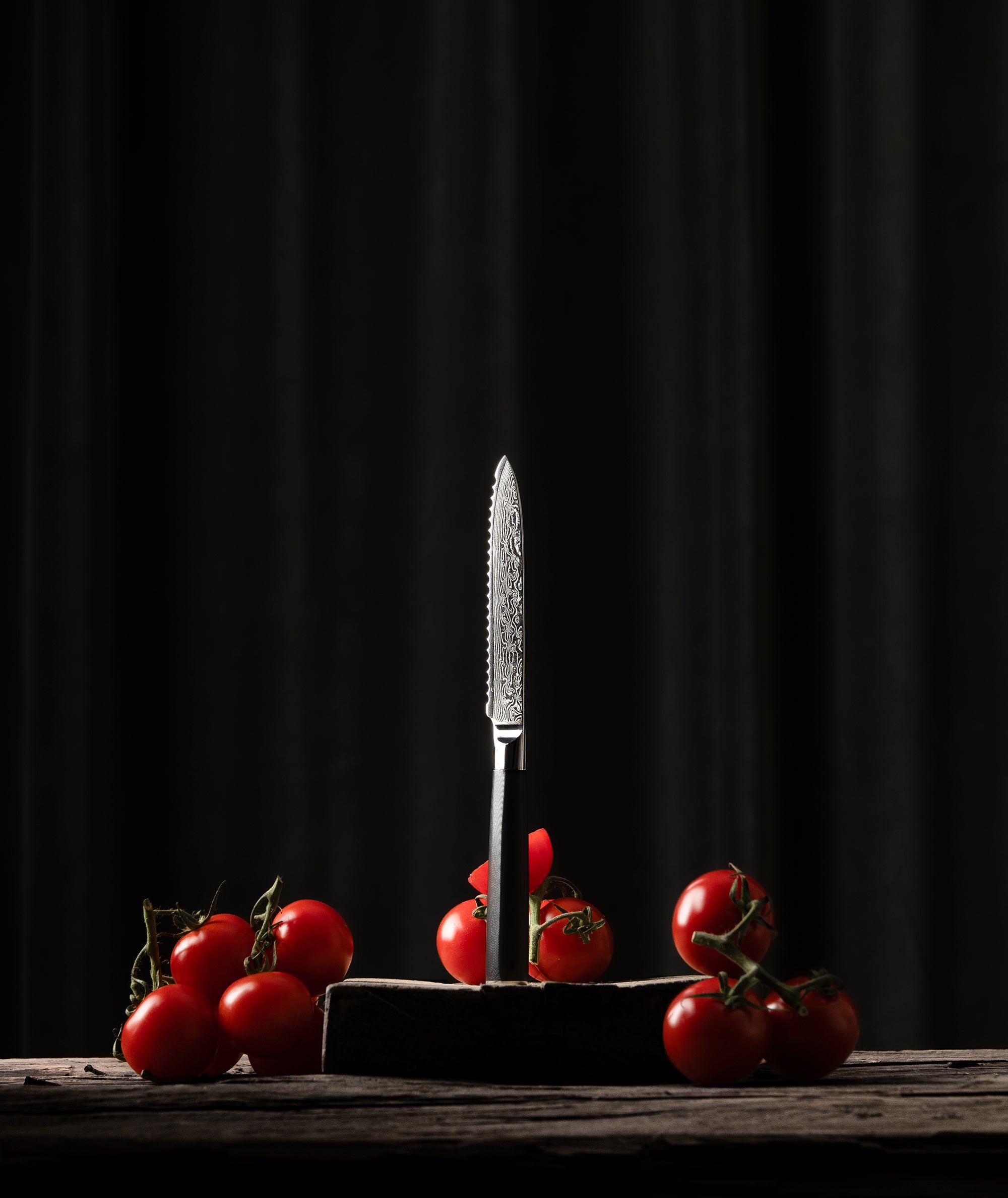 Den tandade eggen bibehåller knivens skärpa över tid, vilket gör att du kan skiva tomater – även efter omfattande användning – samtidigt som du får ett säkrare och mer precist snitt. Den kompakta storleken innebär att kniven inte tar mycket plats i ditt kök, eller om du behöver ta med den på en vandring eller picknick.