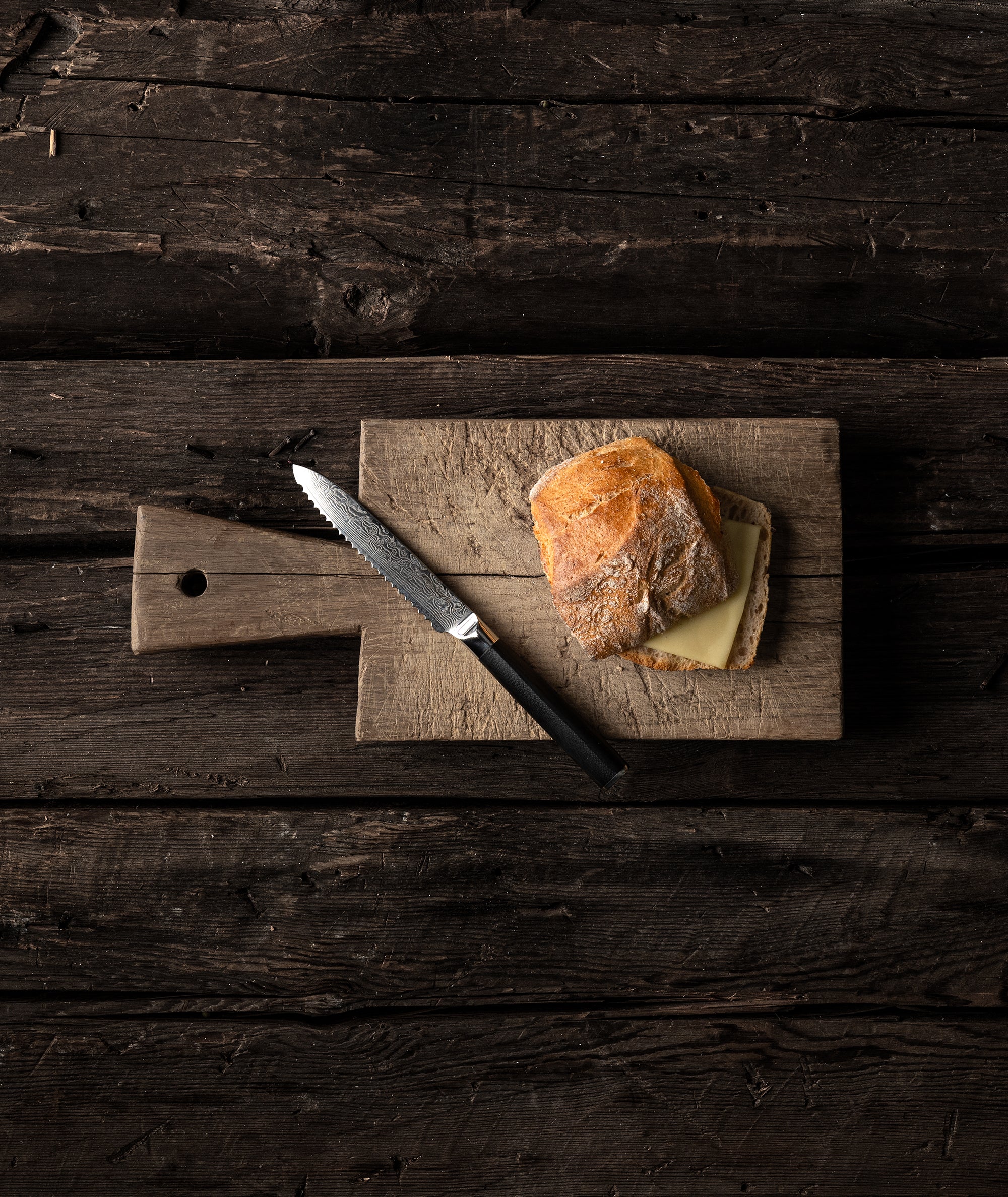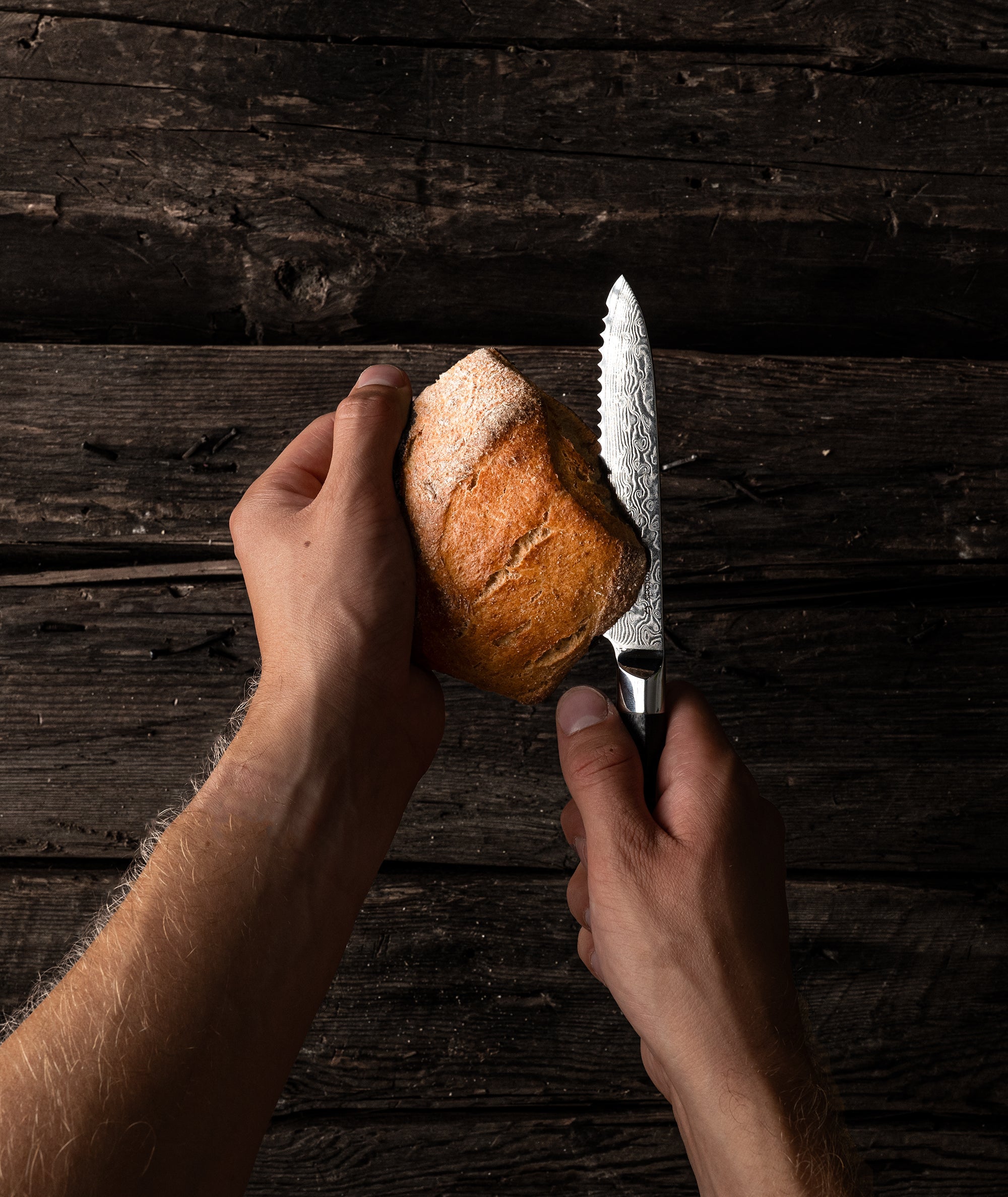 Upplev den oöverträffade mångsidigheten hos vår tandade allroundkniv. Den är placerad mellan en klassisk kockkniv och en skalpell, och den är perfekt för en mängd olika kulinariska uppgifter. Oavsett om du skär saftiga tomater, hårda ostar, charkuterier eller krispigt bröd, skär knivens tandade egg enkelt genom tuffa ytor utan att riva de känsliga insidorna.