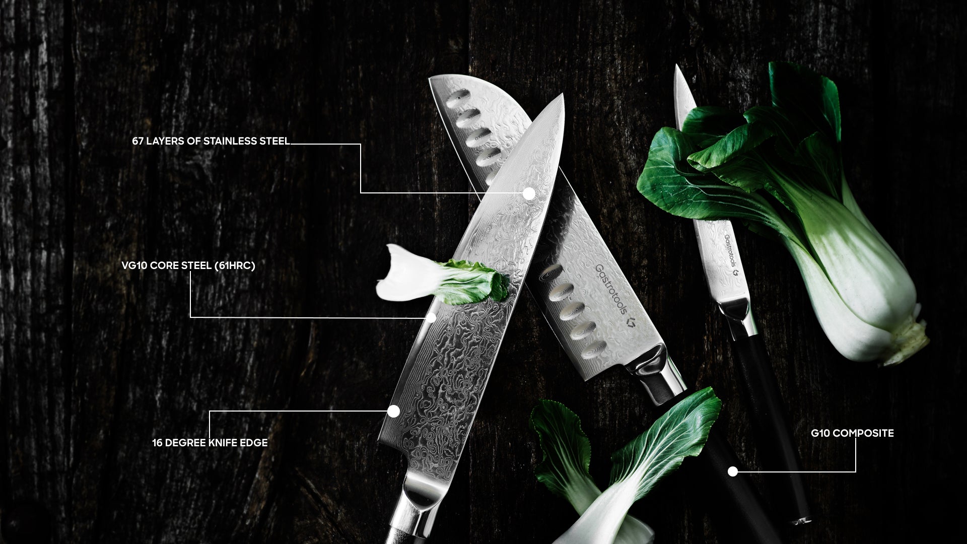 - Stål: VG10-kärnstål omgivet av 66 lager rostfritt stål (totalt 67 lager)